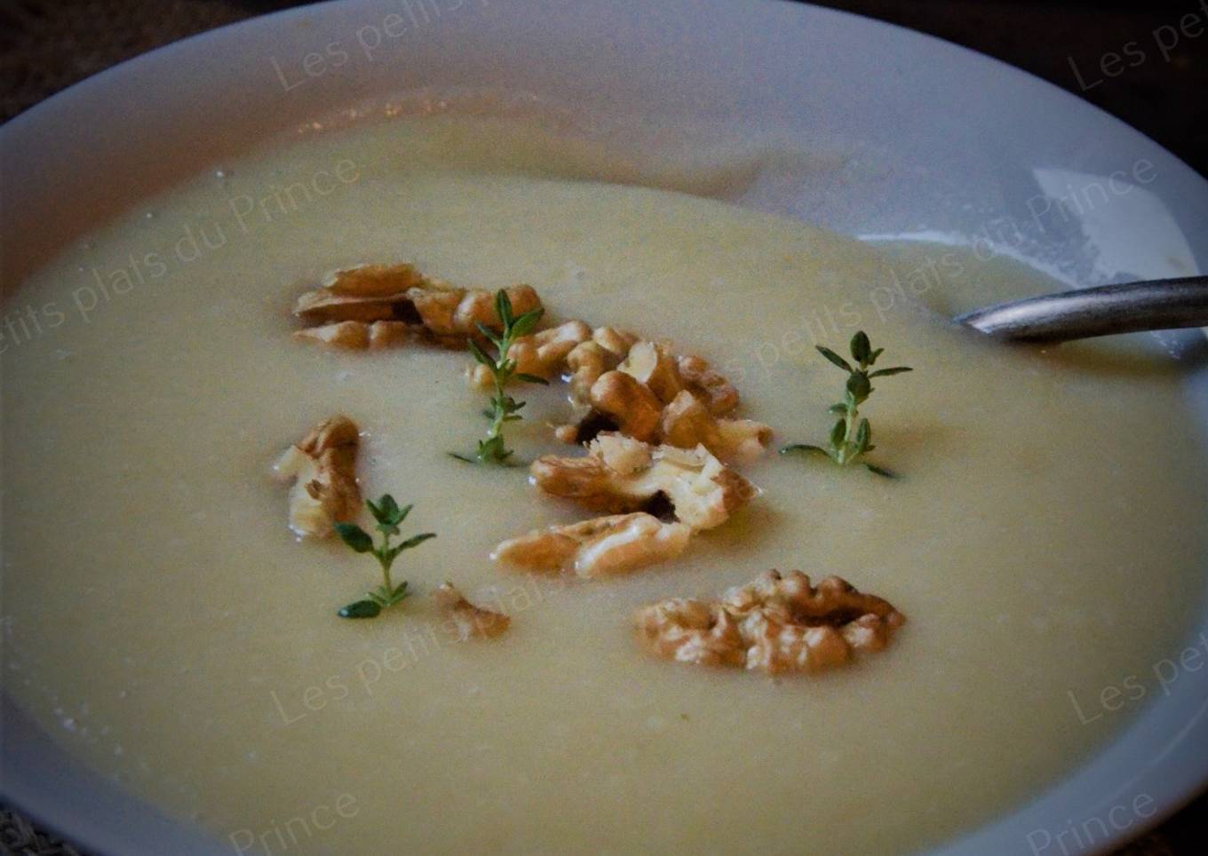 - Versez le velouté bien chaud dans les assiettes creuses. Parsemez les cerneaux de noix. Décorez de quelque brins de thym frais. Servez immédiatement. Vous pouvez ajouter de la crème si vous le souhaitez.